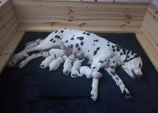 Pünktlich an Tag 63 hat unser Röschen 4 Rüden und 4 Hündinnen das Leben geschenkt. In insgesamt 4 Stunden sind die 8 Geschwister ohne Komplikationen zur Welt gekommen. Mit Geburtsgewichten zwischen 355 und 487 Gramm sind auch die D-chen, wie gewohnt proper und munter.