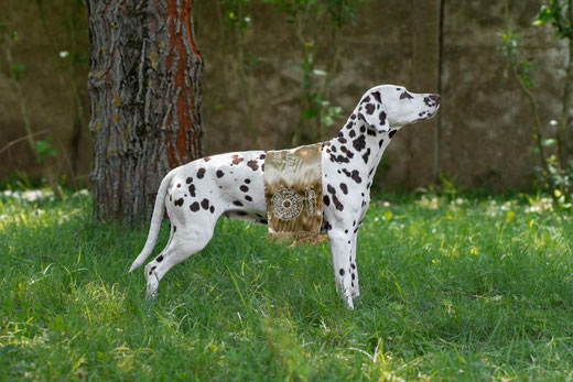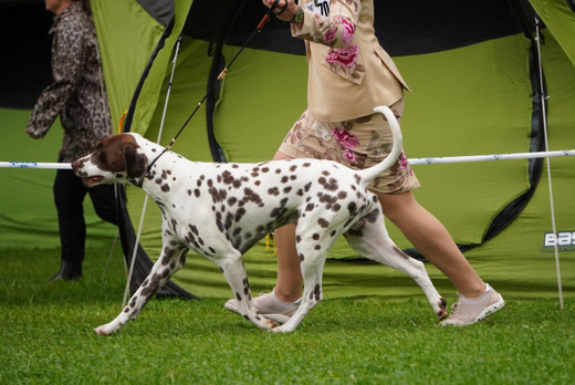 Copper gewann unter 5 Rüden die Funklasse, Berta siegte in der Veteranenklasse unter excellenter Konkurrenz und wurde am Ende Bester Veteran. Röschen erlangte ein Vorzüglich unter 12 Hündinnen in der OK. Romy bekam ein V2 Res CAC in der Zwischenklasse, ebenfalls unter starker Konkurrenz. Am Ende durften dann alle Mädels um den Sonderpreis einen Goldpokal für "die schönsten Dalmatiner-Ohren" laufen. Auch nach der ersten Runde waren alle drei noch im Ring. Am Ende war unsere Romy der Star des Tages und durfte den wunderschönen Pokal mit nach Hause nehmen.